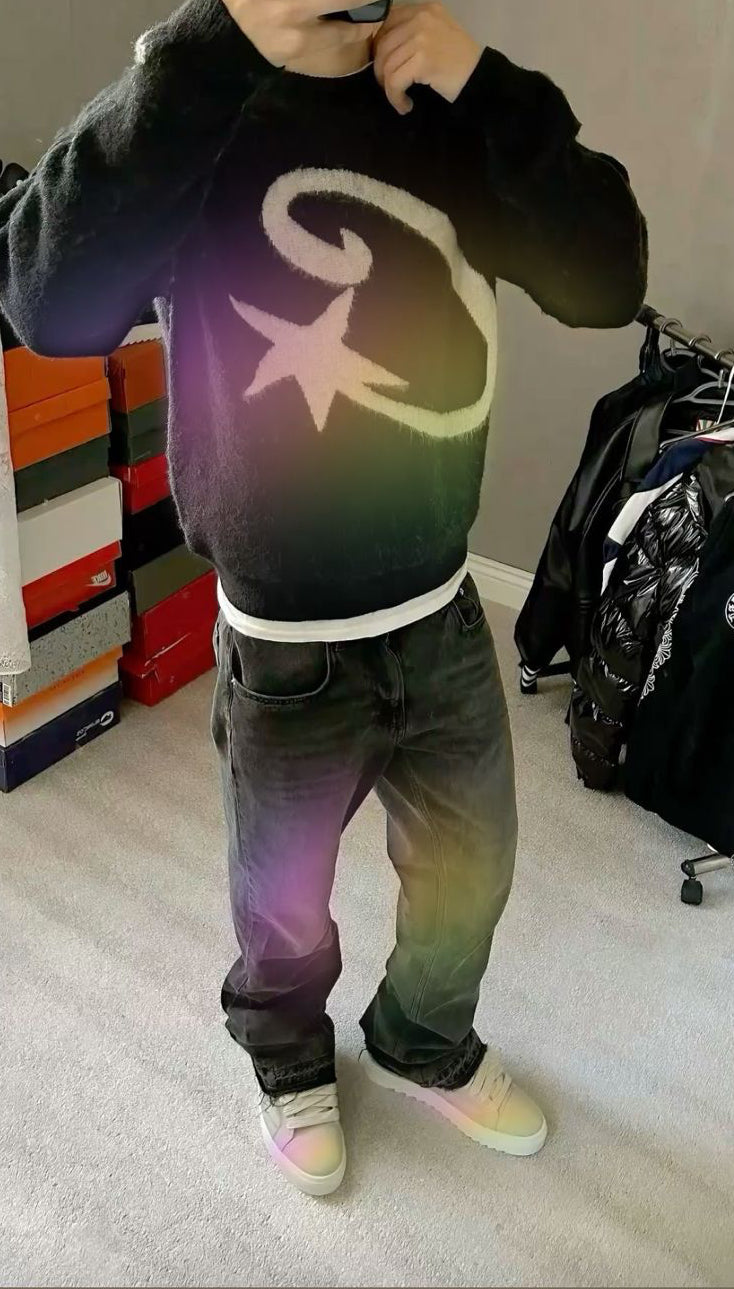 Cozy up in style with this soft pink sweater featuring a bold cream star and swirl design. Crafted from a warm knit fabric, it offers a relaxed fit.